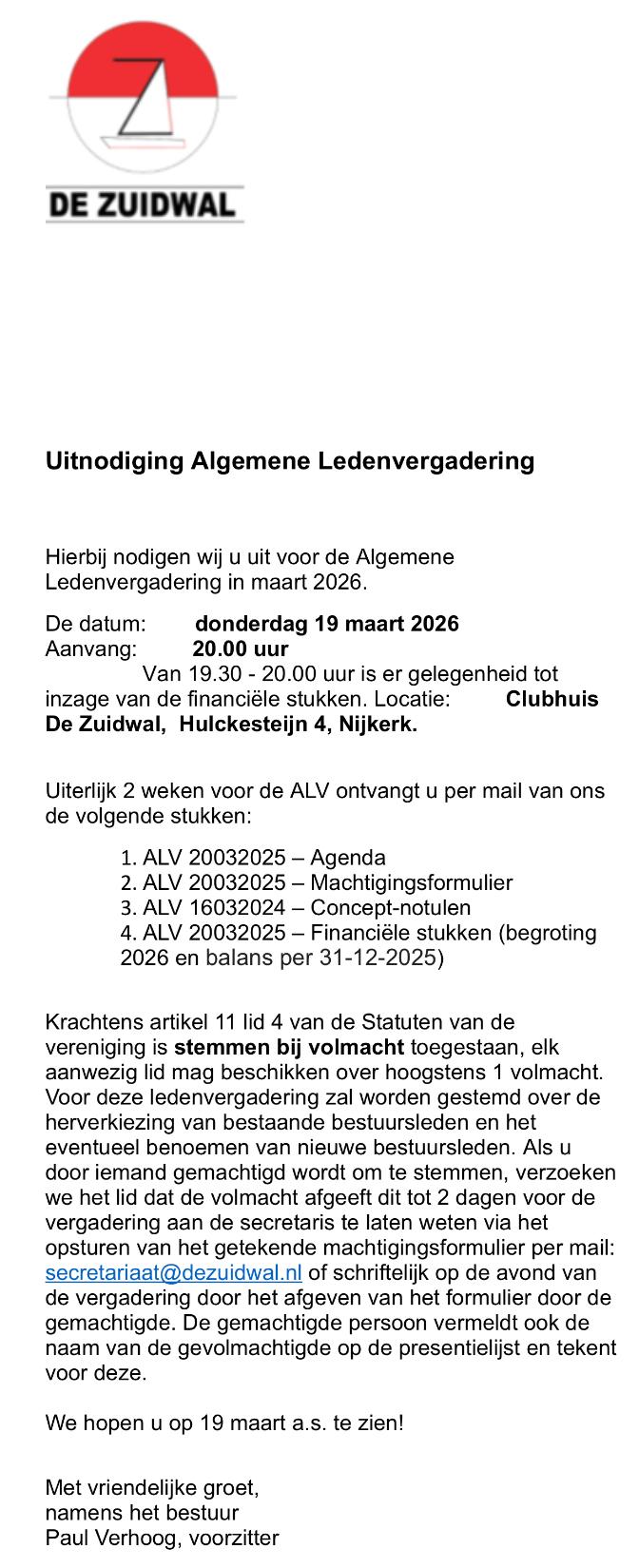 Algemeen | 19:30 - 21:00 | Clubhuis 'De Zuidwal' |